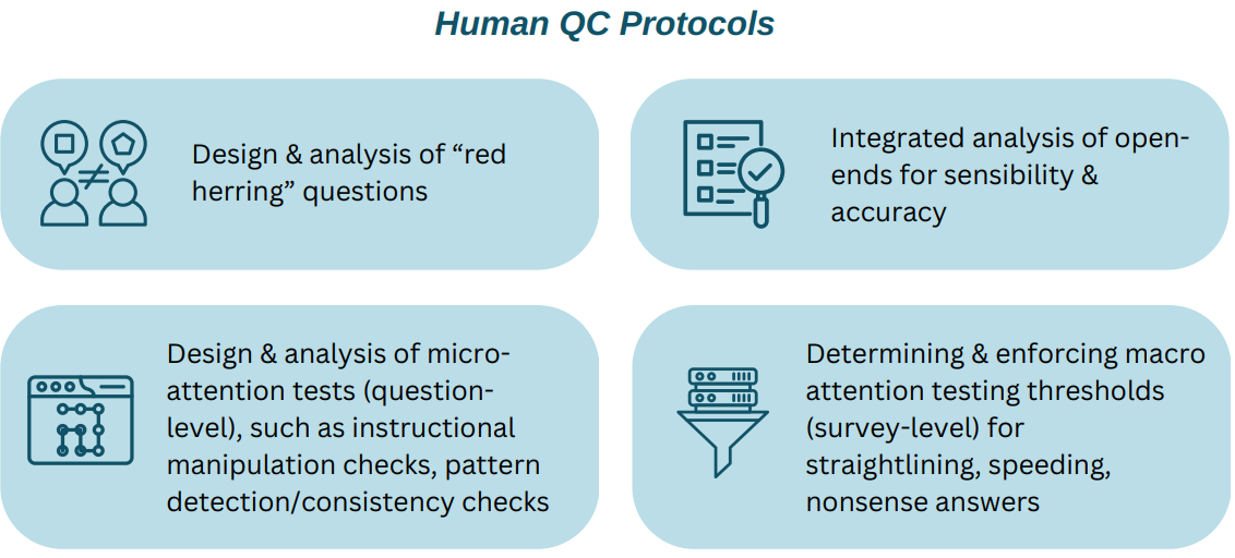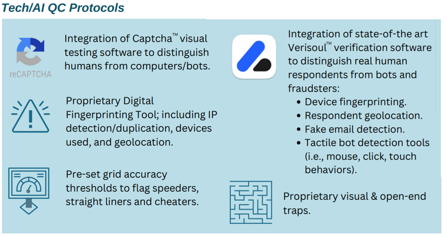 Human-led Countermeasures: Led by Ironwood’s highly experienced Project Management staff, human oversight augments our automated QC protocols by investigating anomalies and indicators of fraud and low-quality participation.